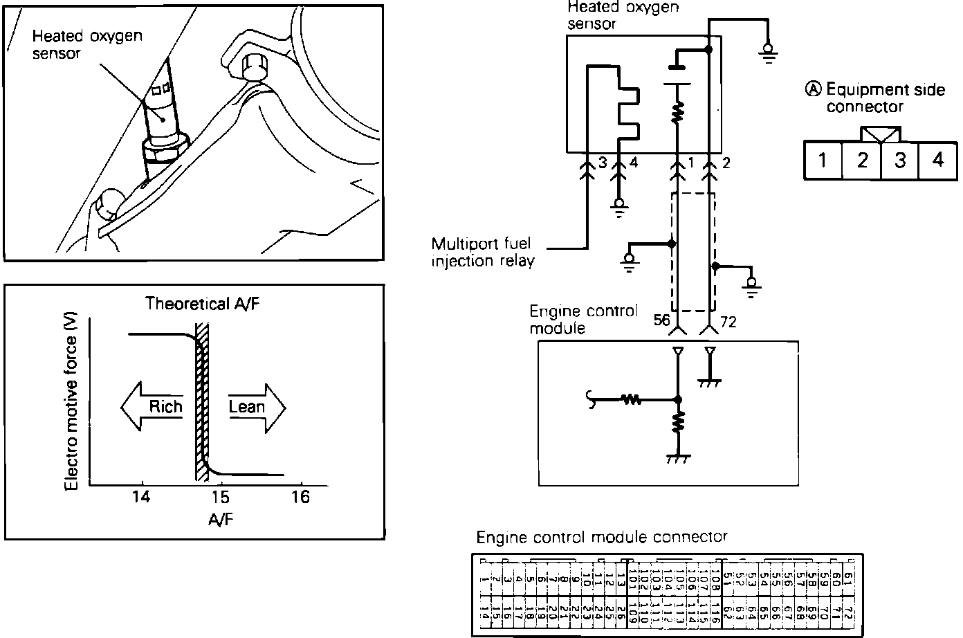 2. Using an Ohmmeter, check for continuity between the ECM harness connector terminal 56 and the oxygen sensor harness connector terminal 1.