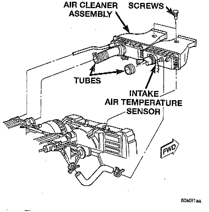 3. Remove intake air temperature sensor electrical connector from air cleaner. Remove throttle body hoses and air cleaner assembly.