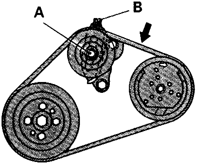 b. Adjust tension to specification with adjusting bolt (B -in illustration), 0.20-0.24 inch for a new belt and o.24-o.28 inch for used belt. [01]