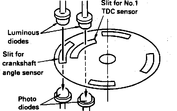 The disc contains 4 large slits around its circumference to indicate the crankshaft angle. An additional light-transmission slit located inward from the edge is used to indicate number one cylinder's top dead center position. The pick-up unit assembly uses two luminous diodes and two photo diodes, in order to detect the two different slits.