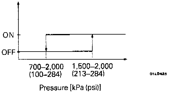 The battery voltage in the engine control module is applied through a resistor to the power steering pressure switch. Steering operation causes the power steering fluid pressure to increase, turning the switch on. As a result, continuity is produced between the battery voltage applied and ground. This causes the power steering fluid pressure terminal voltage to go from high to low.