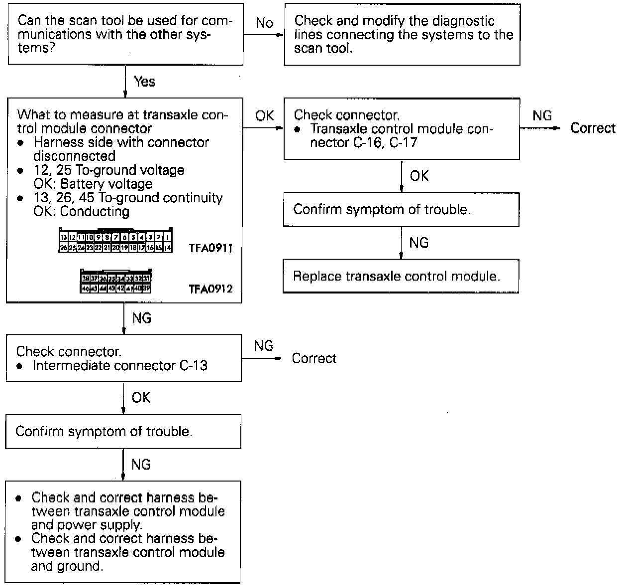 When no communications can be made with the scan tool, it is likely that the diagnostic line is defective or that the transaxle control module is not functioning
