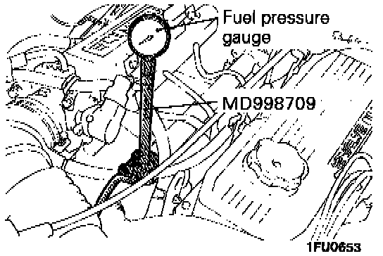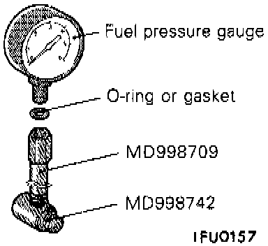 NOTE: Use a suitable O-ring or gasket between the fuel pressure gauge and the special tool so as to seal in order to prevent fuel leakage at this time.