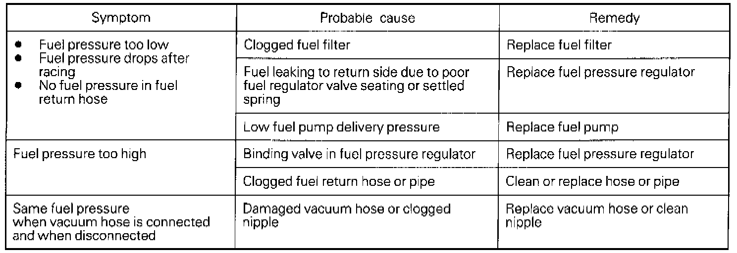 13. If any of fuel pressure measured in steps (8) to (11) is out of specification, troubleshoot and repair according to the table above.