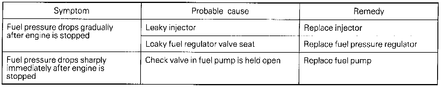 14. Stop the engine and check change of fuel pressure gauge reading. Normal if the reading does not drop within 2 minutes. If it does, observe the rate of drop and troubleshoot and repair according to the table above.