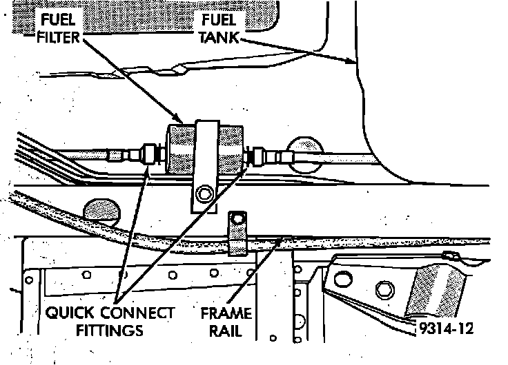The fuel filter is mounted to the frame rail, in front of the fuel tank.