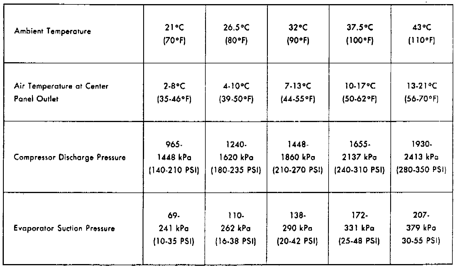 6. Operate A/C for two minutes and take discharge air temperature readings.If temperature increased by more than 5°F, check blend air door for correct operation. If temperature does not increase more than 5°F, compare discharge air temperature, suction and discharge pressures with values in the performance chart corresponding with the ambient temperature.