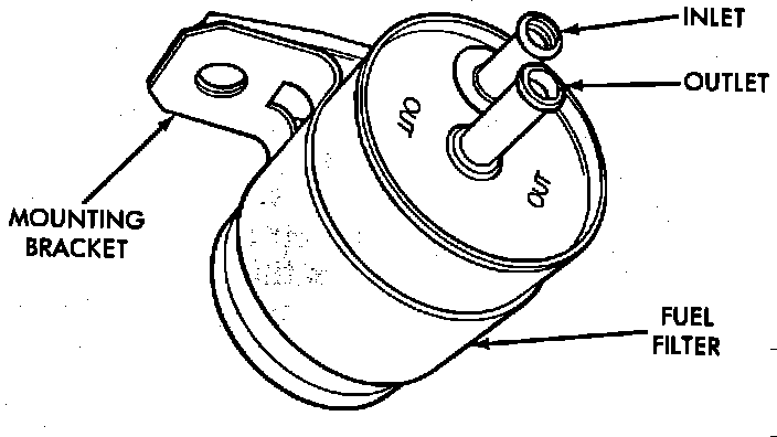 4. Remove fuel filter hoses and clamps from the inlet and outlet fuel lines. Remove mounting bracket bolt, and remove filter.