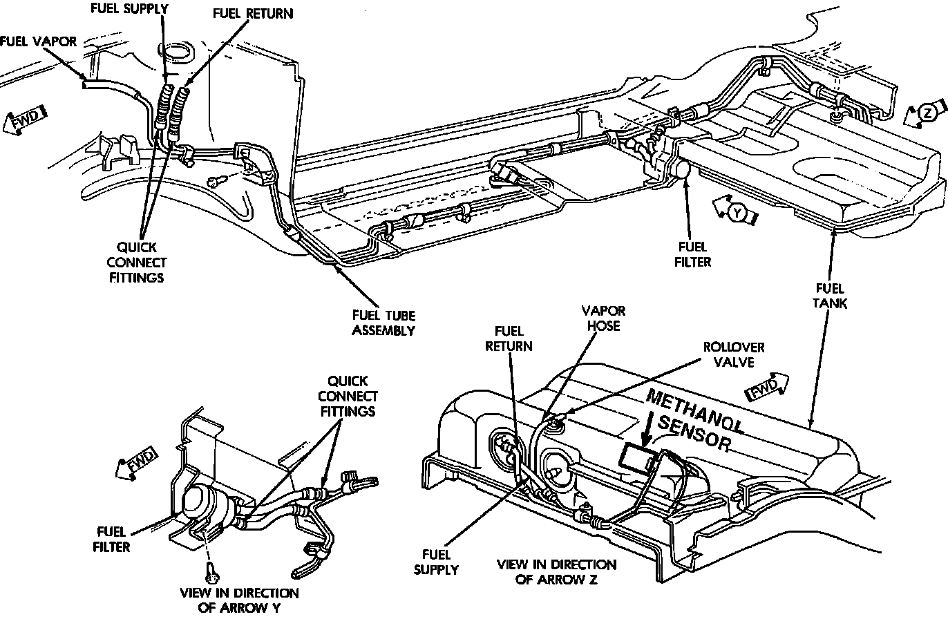 The in-line fuel filter is found near the right side frame rail just ahead of the fuel tank.
