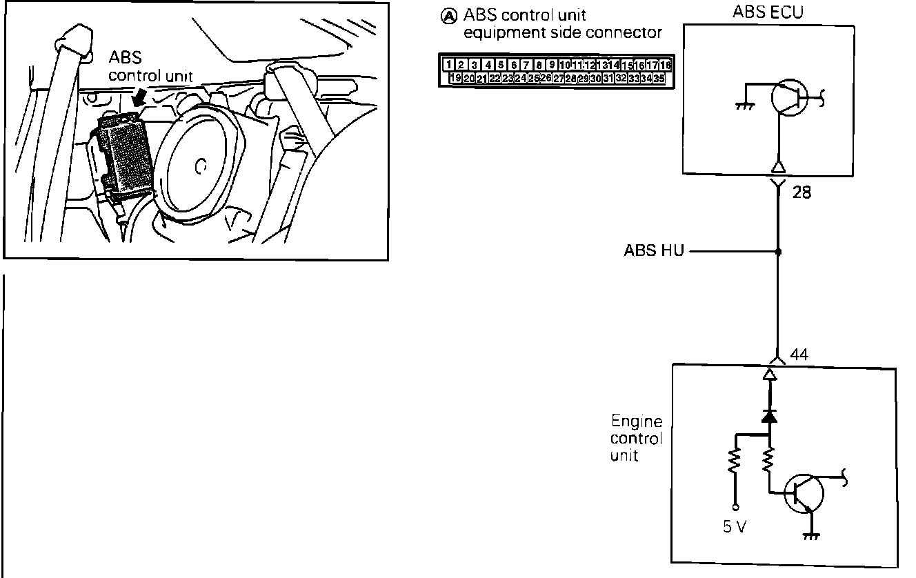 The ECM provides the ABS control unit with a 5 Volt reference signal. The ECM monitors this signal. When the ABS control unit determines that brake control is needed, the ABS control unit completes the ground circuit from the ECM. When this voltage drop is detected by the ECM, the ECM operates the idle speed control servo to provide effective anti-lock braking.