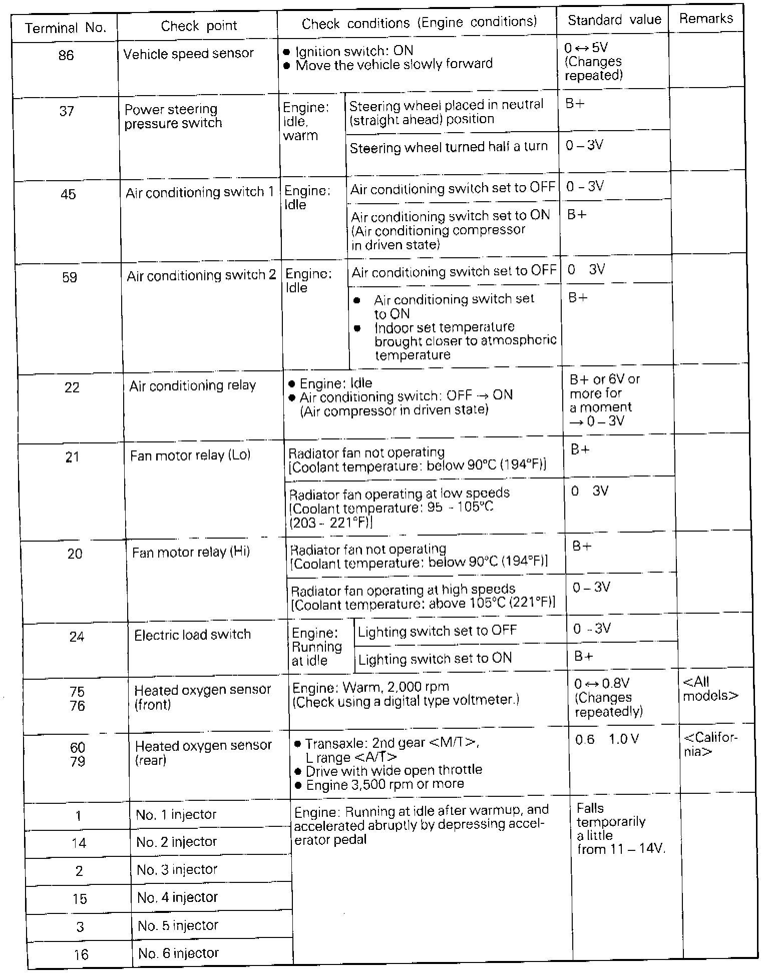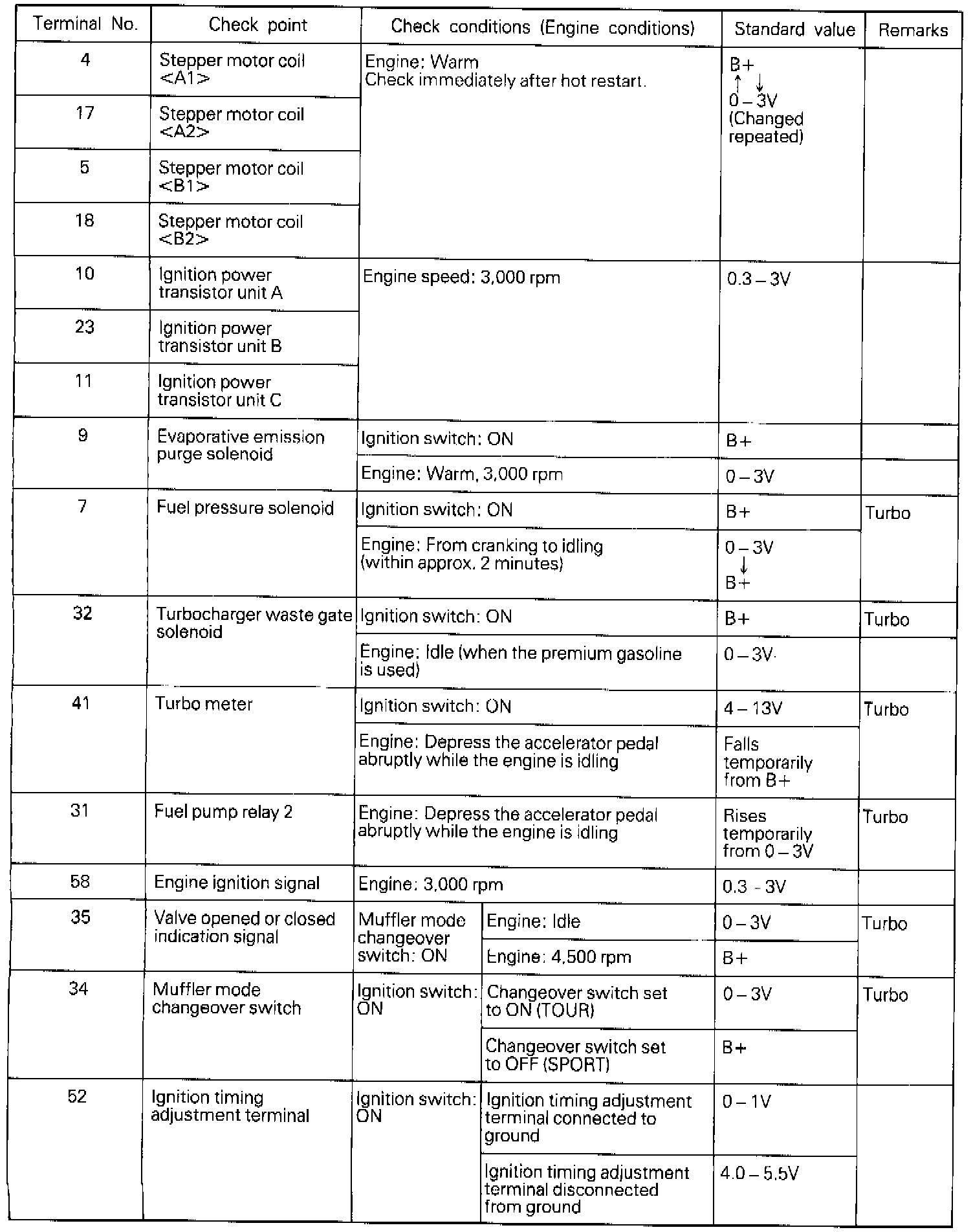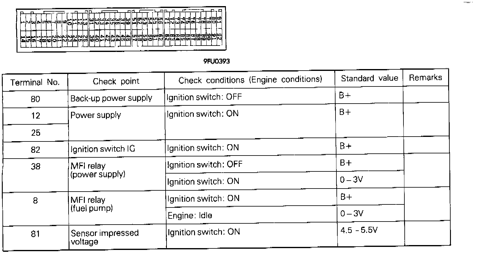 2. Insert the very thin probe from the wire side into contact with each of the terminals of the Engine Control Module (ECM) connector and check the voltage, while referring to the check chart.