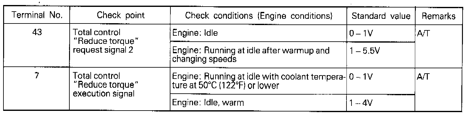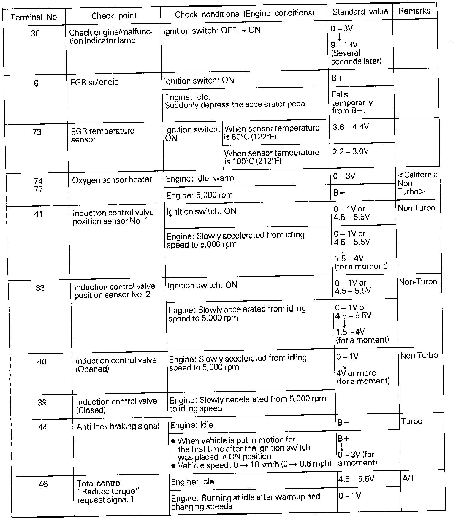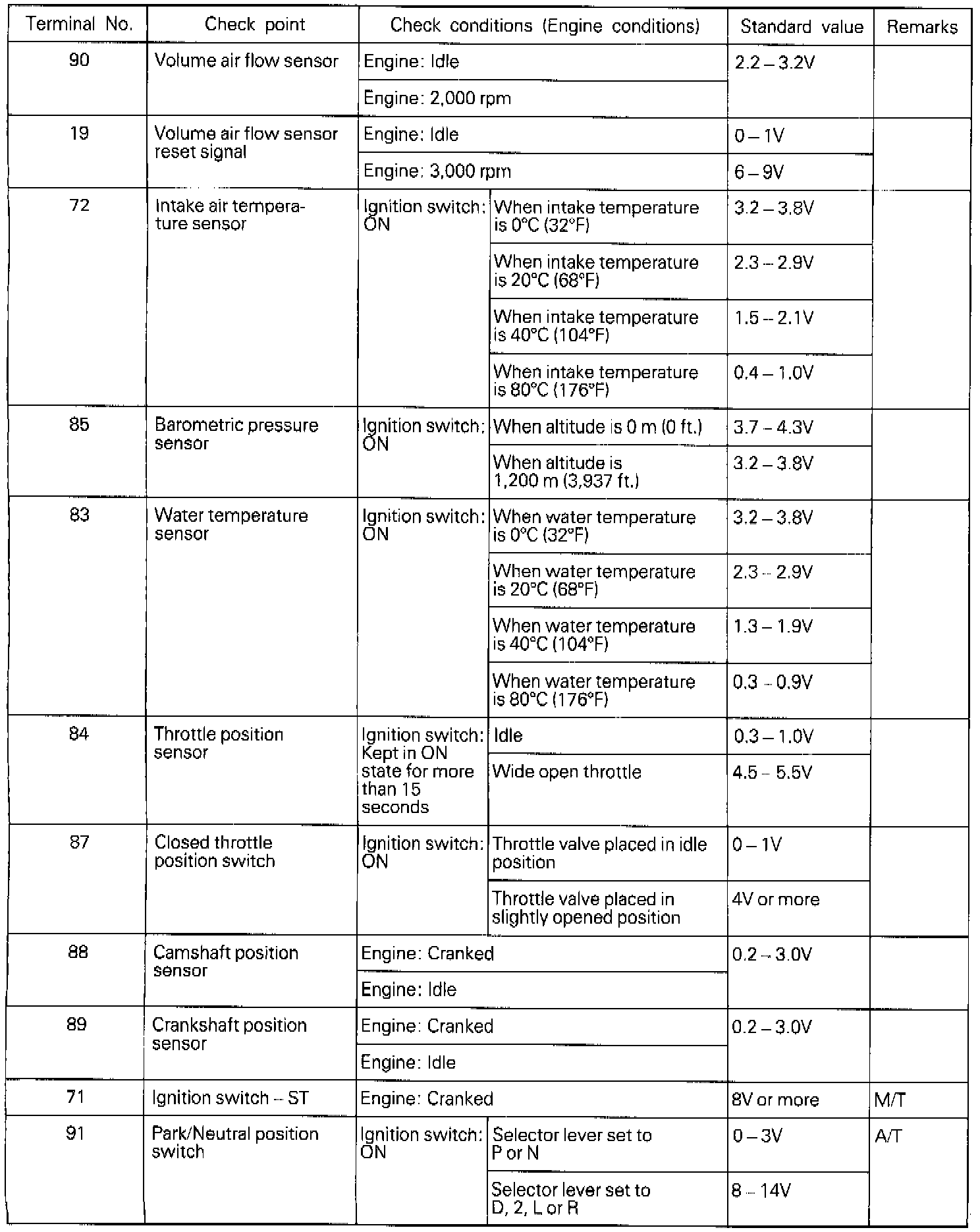 2. Insert the very thin probe from the wire side into contact with each of the terminals of the Engine Control Module (ECM) connector and check the voltage, while referring to the check chart.