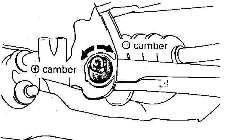 To adjust camber, turn lower control arm mounting bolt on the crossmember side. At the left wheel turn the mounting bolt clockwise to indicate negative camber, at the right wheel turn the mounting bolt right to indicate positive camber. One graduation changes camber by about 0.2°. Adjust eccentric cam bolt within 90° from central position.