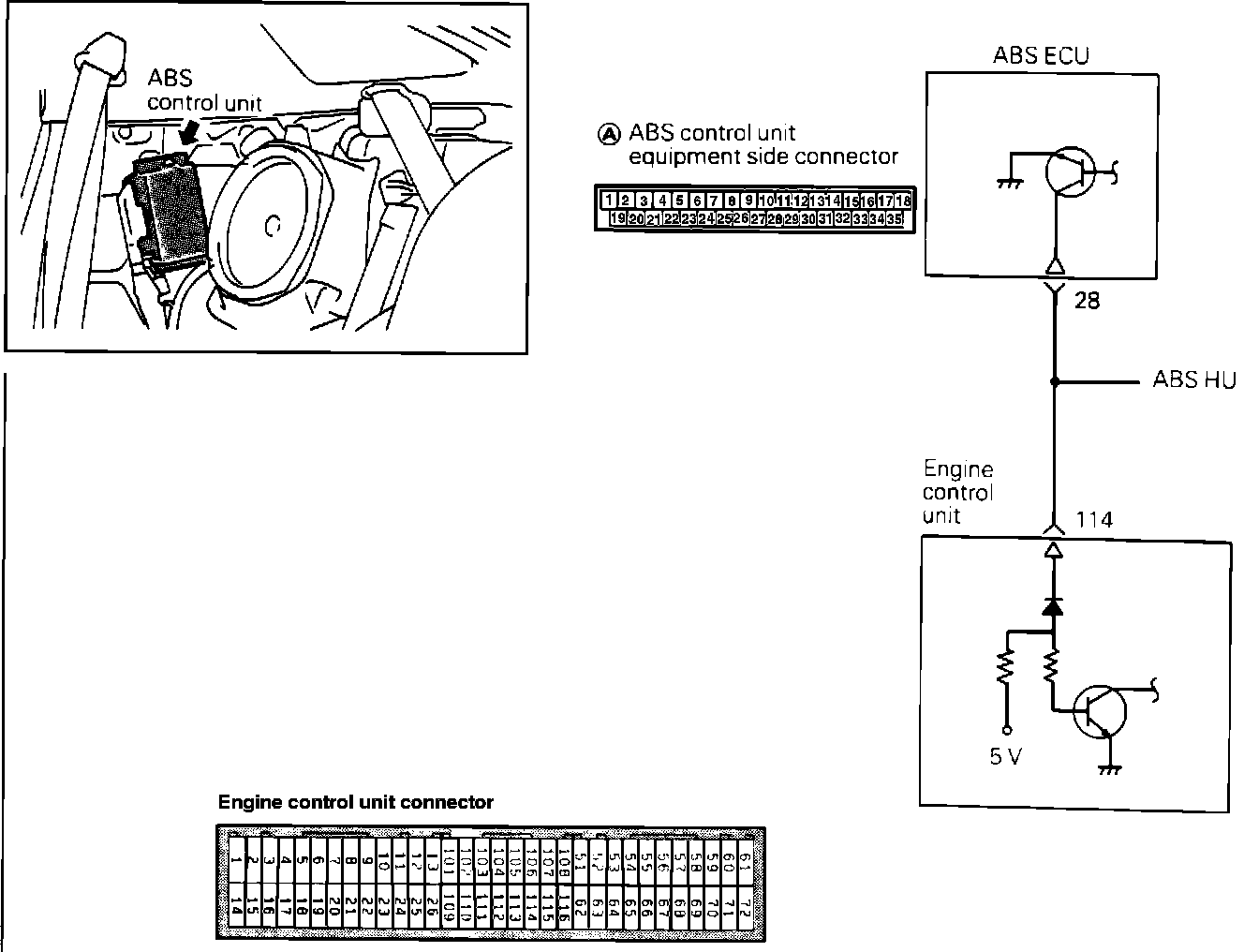 The ECM provides the ABS control unit with a 5 Volt reference signal. The ECM monitors this signal. When the ABS control unit determines that brake control is needed, the ABS control unit completes the ground circuit from the ECM. When this voltage drop is detected by the ECM, the ECM operates the idle speed control servo to provide effective anti-lock braking.