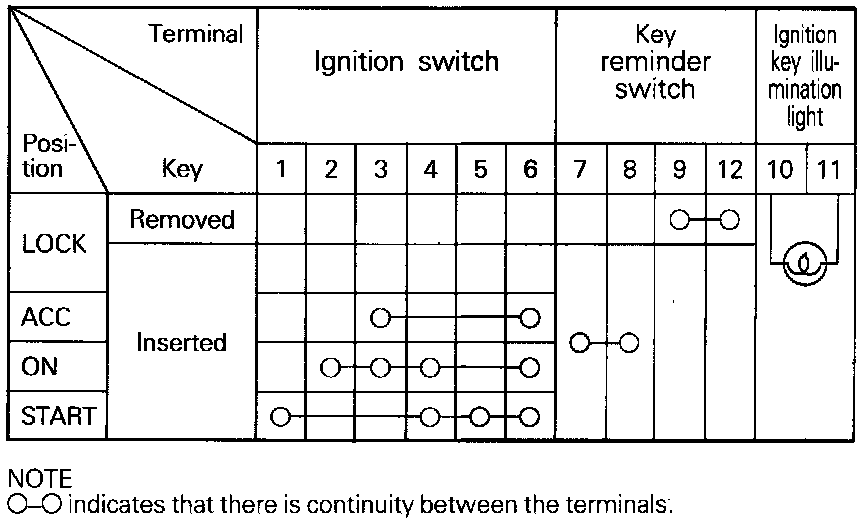 2. Disconnect the wiring connector from the ignition switch and key reminder switch, and connect an ohmmeter to the switch side connector