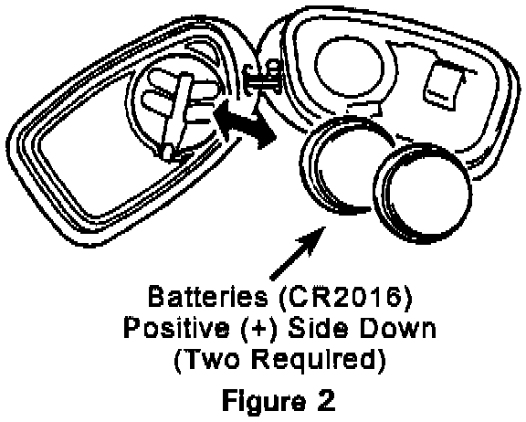 2. If the red indicator lamp does not illuminate when the buttons are pressed, check and replace the internal batteries as necessary. The new batteries should be installed with the positive (+) side down. Use battery model CR2016.