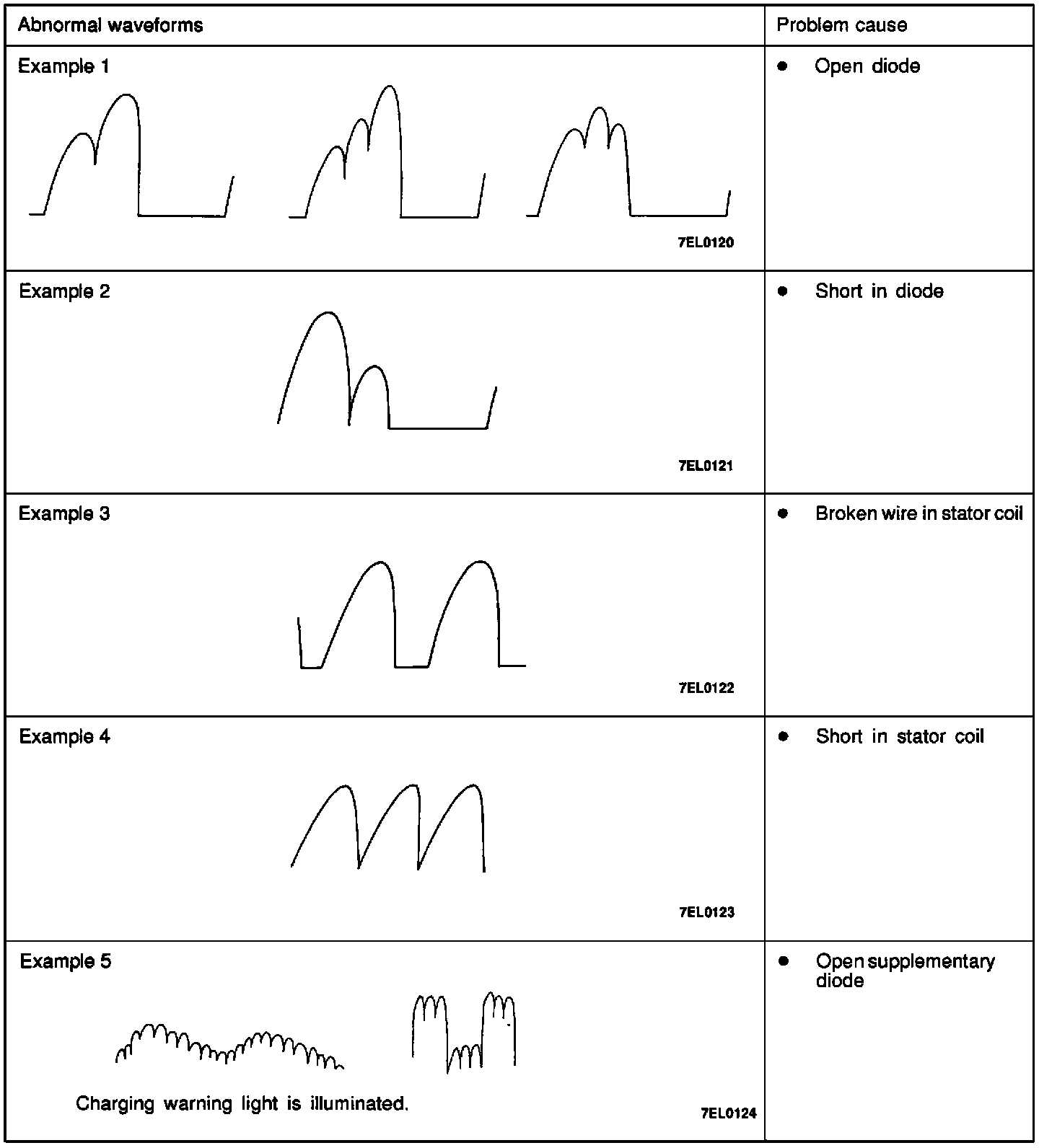 2. Identification of abnormal waveforms is easiest with a large output current (regulator not operating). These waveforms can be observed when the headlights are on.