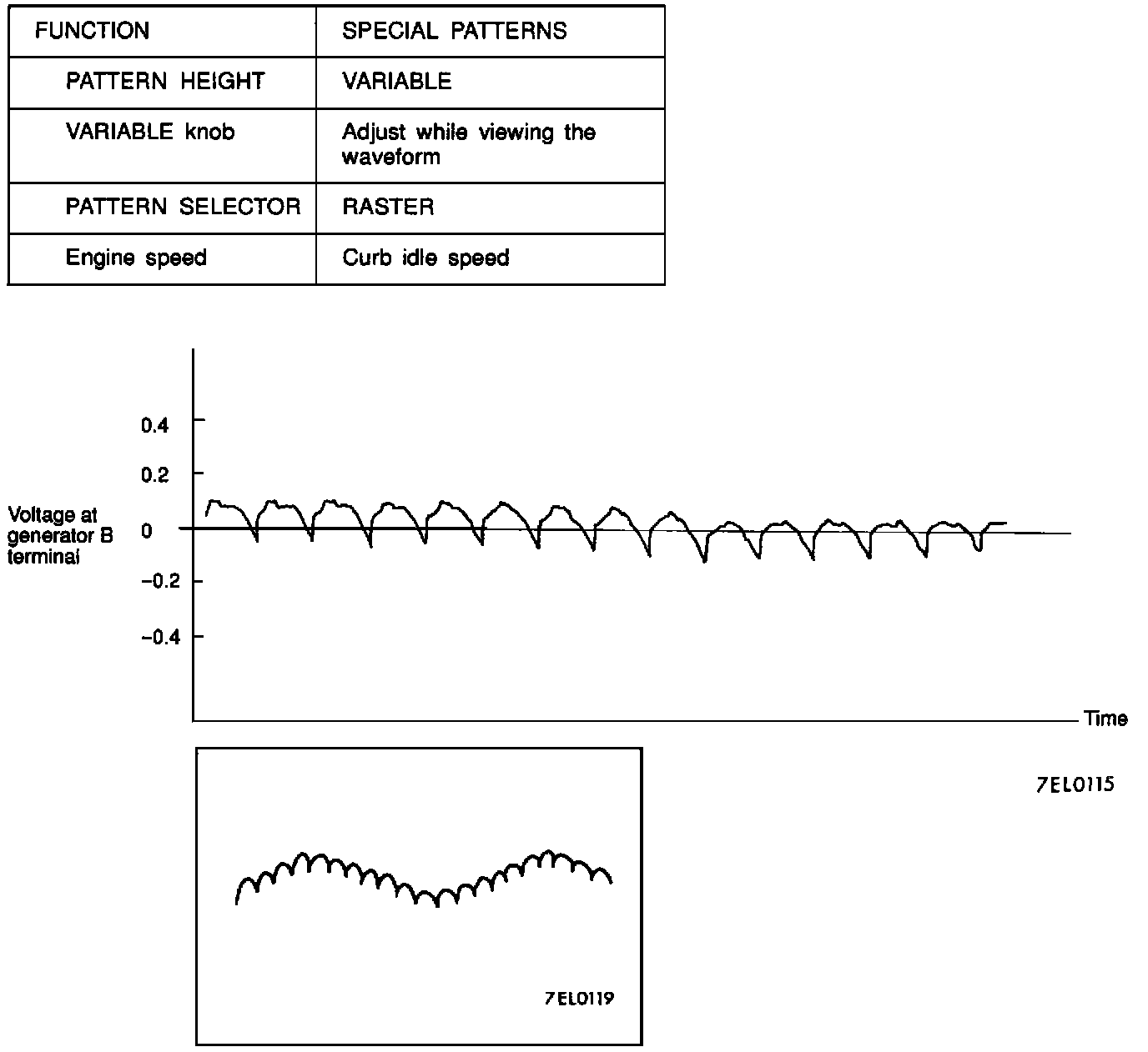 NOTE: The voltage waveform of the generator B terminal can undulate as shown at left. This waveform is produced when the regulator operates according to fluctuations in the generator load (current) and is normal for the generator.