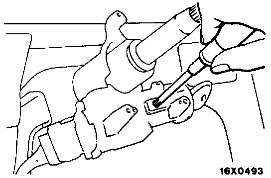 2. Using a cross-tip (+) screwdriver (small) or a similar tool, push the lock pin of the steering lock cylinder inward and then pull the steering lock cylinder toward you.