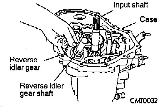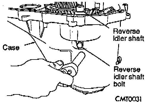 18. Install reverse idler gear and shaft. Install bolt into shaft. Tighten bolt on shaft to 26 Nm (19 ft. lbs.) torque.