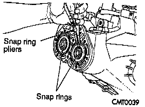 12. Install shaft snap rings at input and output bearings.