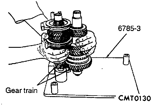 NOTE: The sealant used to seal the transaxle case halves is MOPAR 54 Gasket Marker, Loctite 518 or equivalent. The sealant used for the bearing end plate cover is MOPAR 54 RTV.1. Verify bench fixture shims are removed from bench fixture. Install output and input gear into pallet fixture (Miller tool #6785-3, or equivalent).