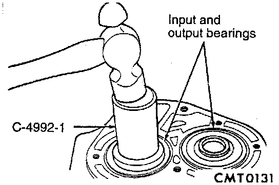 11. Position input and output bearings on the shafts. Using Miller tool #C-4992-1, or equivalent press input and output shaft bearings until they bottom into the case and against the shafts.