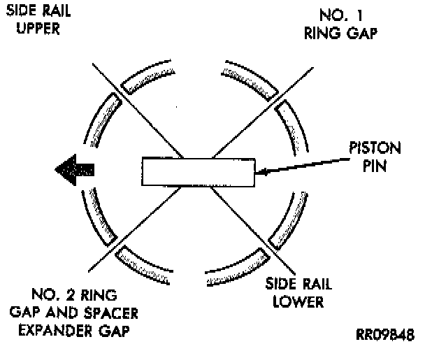 6. Position oil ring expander gap at least 45° from the side rail gaps but not on the piston pin center or on the thrust direction. Staggering ring gap is important for oil control.