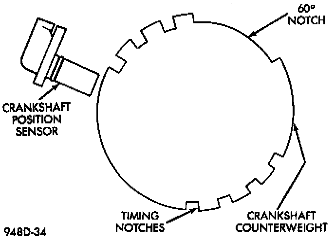 By counting the pulses and referencing the pulse from the 60 degree signature notch, the PCM calculates crankshaft angle (position). In each group of timing reference notches: