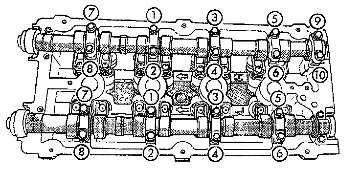 1. Lubricate bearing journals and cam followers with clean oil and install the camshafts. Install right and left camshaft bearing caps #2 thru #5 and right #6. Tighten M6 fasteners to 12 N.m (105 in. lbs.) in sequence.