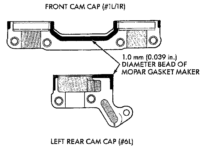 2. Apply Mopar Gasket Maker to No.1 and No.6 bearing caps. Jnstall bearing caps and tighten M8 fasteners to 24 N.m (215 in. lbs.).