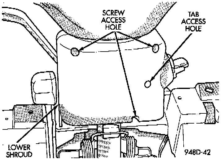2. Place key cylinder in Run position. Through the hole in the lower shroud, depress lock cylinder retaining tab and remove key cylinder.
