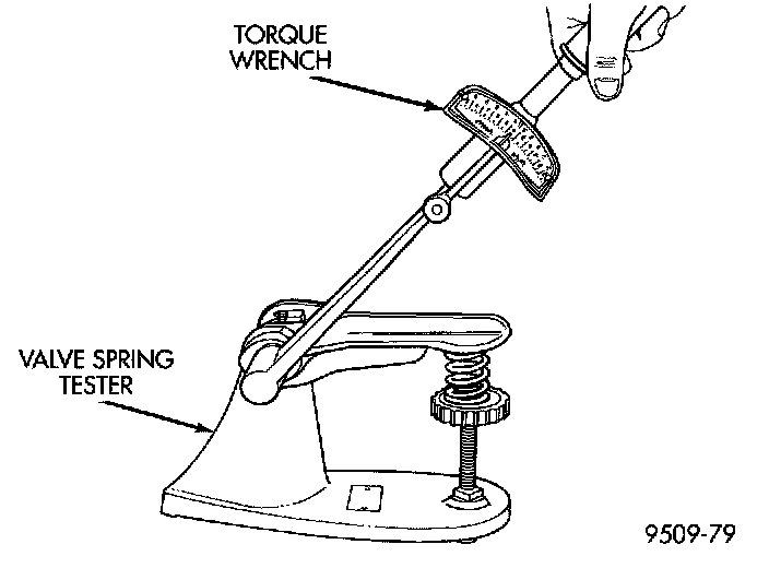 1. Whenever valves have been removed for inspection, reconditioning or replacement, valve springs should be tested. As an example, the compression length of the spring to be tested is 33.34 mm (1-5/16 inches). Turn tool table until surface is in line with the 33.34 mm (1-5/16 inch) mark on the threaded stud and the zero mark on the front. Place spring over stud on the table and lift compressing lever to set tone device. Pull on torque wrench until ping is heard. Take reading on torque wrench at this instant. Multiply this reading by two. This will give the spring load at test length. Fractional measurements are indicated on the table for finer adjustments. Discard the springs that do not meet specifications. The Following specifications apply to both intake and exhaust valve springs;