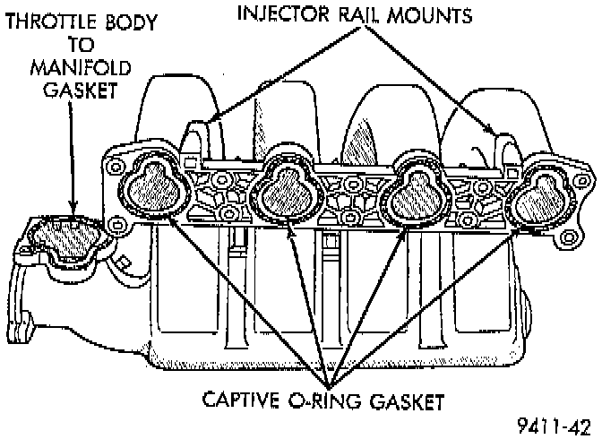2. Remove covering from fuel injector holes and insure the holes are clean. Install fuel rail assembly to intake manifold. Tighten screws to 23 Nm (200 inch lbs.).