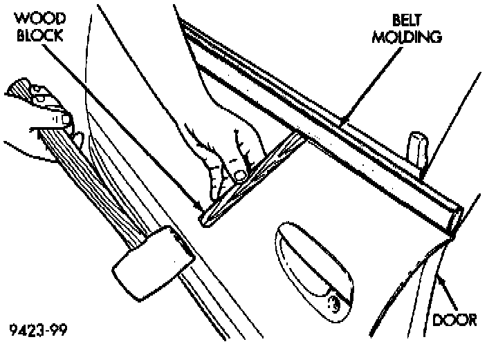 2. Using a rubber mallet and block of wood, tap upward at each clip holding belt molding to door.