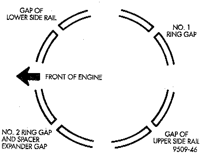 1. Before installing pistons and connecting rod assemblies into the bore, be sure that compression ring gaps are staggered so that neither is in line with oil ring rail gap.2. Before installing the ring compressor, make sure the oil ring expander ends are butted and the rail gaps located as shown. As viewed from top.