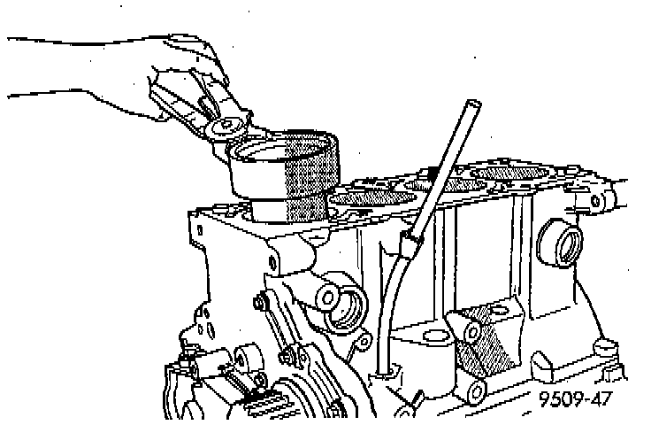 6. Tap the piston down in cylinder bore, using a hammer handle. At the same time, guide connecting rod into position on connecting rod journal.