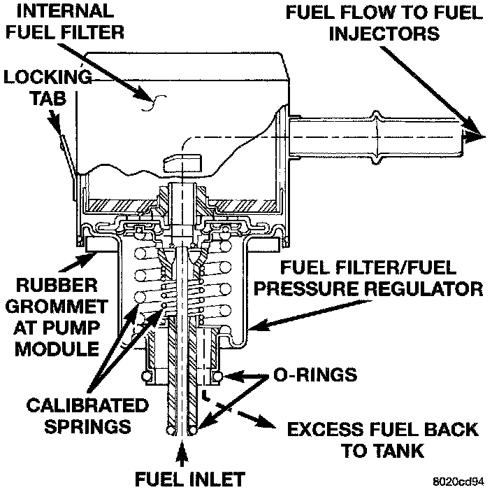 Fuel is supplied to the filter/regulator by the electric fuel pump through an opening tube at the bottom of filter/regulator.