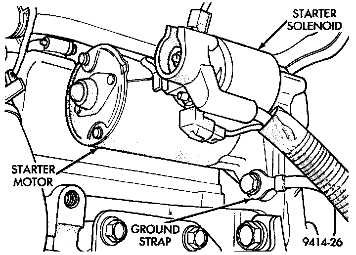 12. Inspect for corrosion on the electrical connections at the starter motor solenoid. Check the ground cable connection below the starter motor.