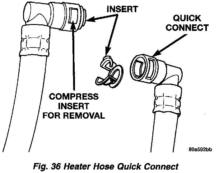 3. ON Right Hand Drive (RHD) vehicles, heater hoses at the heater core connection have quick connects. The quick connect consist of two pieces; a quick connect and insert. The quick connect is removed by compressing the insert with a pliers, and pulling the quick connect free of the insert/nipple. Carefully compressed insert pulling the quick connect from connector nipple. The insert will remain on the connector nipple as the quick connect is removed.