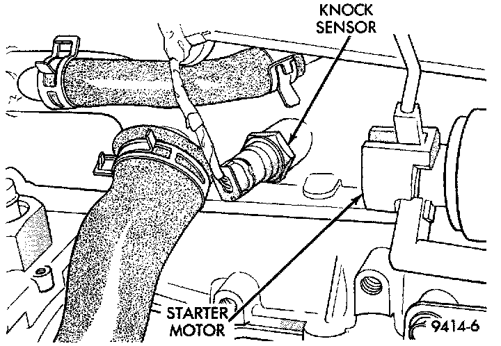 The knock sensor threads into the side of the cylinder block in front of the starter (Fig. 15). When the knock sensor detects a knock in one of the cylinders, it sends an input signal to the PCM. In response, the PCM retards ignition timing for all cylinders by a scheduled amount.