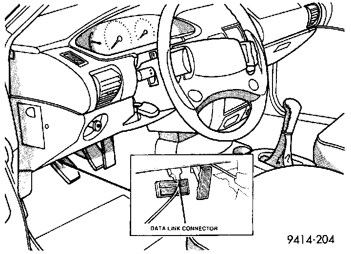 The data link connector ([1][2]diagnostic connector) links the DRB or scan tool with the powertrain control module (PCM). The data link connector is located inside the vehicle, under the instrument panel, left of the steering column (Fig. 26).