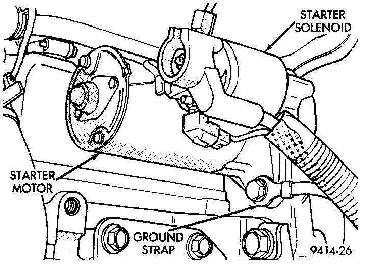 12. Inspect for corrosion on the electrical connections at the starter motor solenoid. Check the ground cable connection below the starter motor.