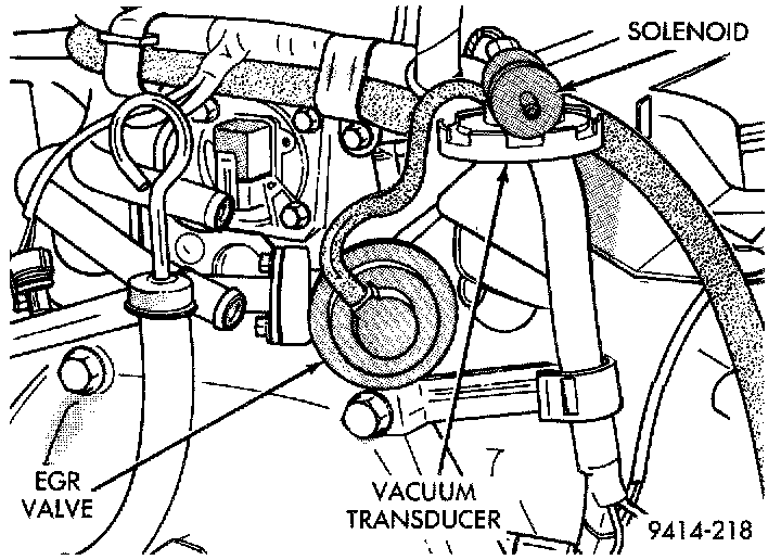 16. Check the electrical connector at the Electronic EGR transducer. Inspect the vacuum and back pressure hoses at the solenoid and transducer for leaks.