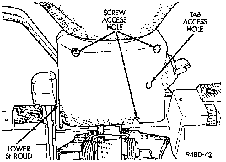 2. Place key cylinder in RUN position. Through the hole in the lower shroud, depress lock cylinder retaining tab and remove key cylinder.