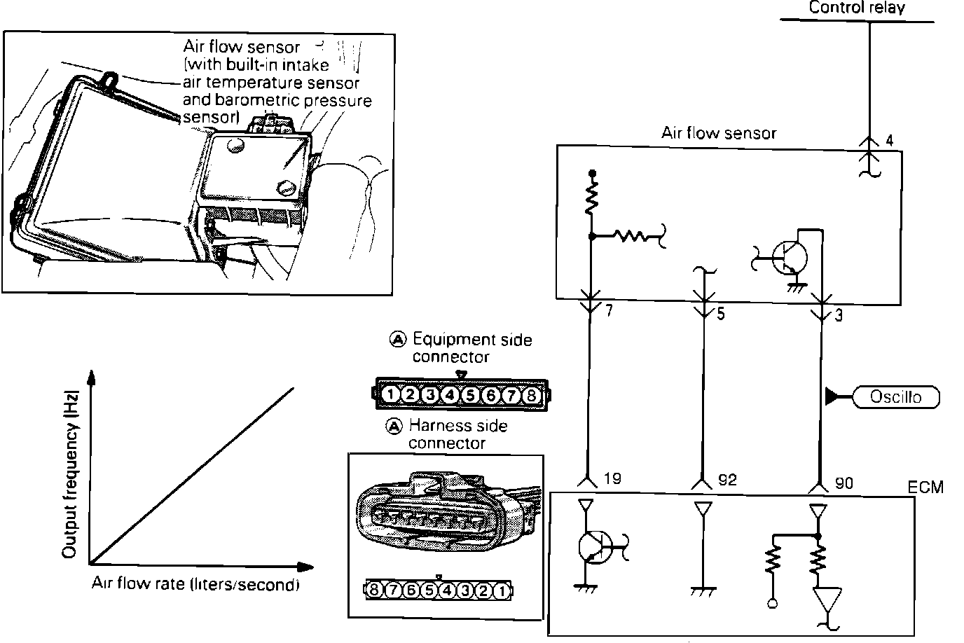 The Air Flow Sensor (AFS), attached to the upper air filter housing, measures the amount of air entering the intake manifold to provide the ECM with precise intake volume information. The AFS is a "Karman Vortex" type which measures the intake air volume.