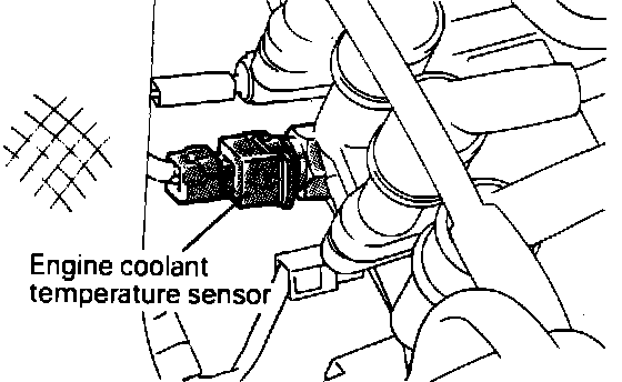 The Engine Coolant Temperature Sensor is located in the thermostat housing at the rear of the engine.