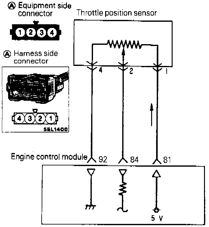 As the throttle shaft rotates, the output voltage of the TPS changes. The Engine Control Module (ECM) determines the throttle valve opening based on the output voltage. The ECM computes throttle valve opening change (output voltage change) and judges the engine acceleration state and accordingly corrects fuel injection amount during acceleration.