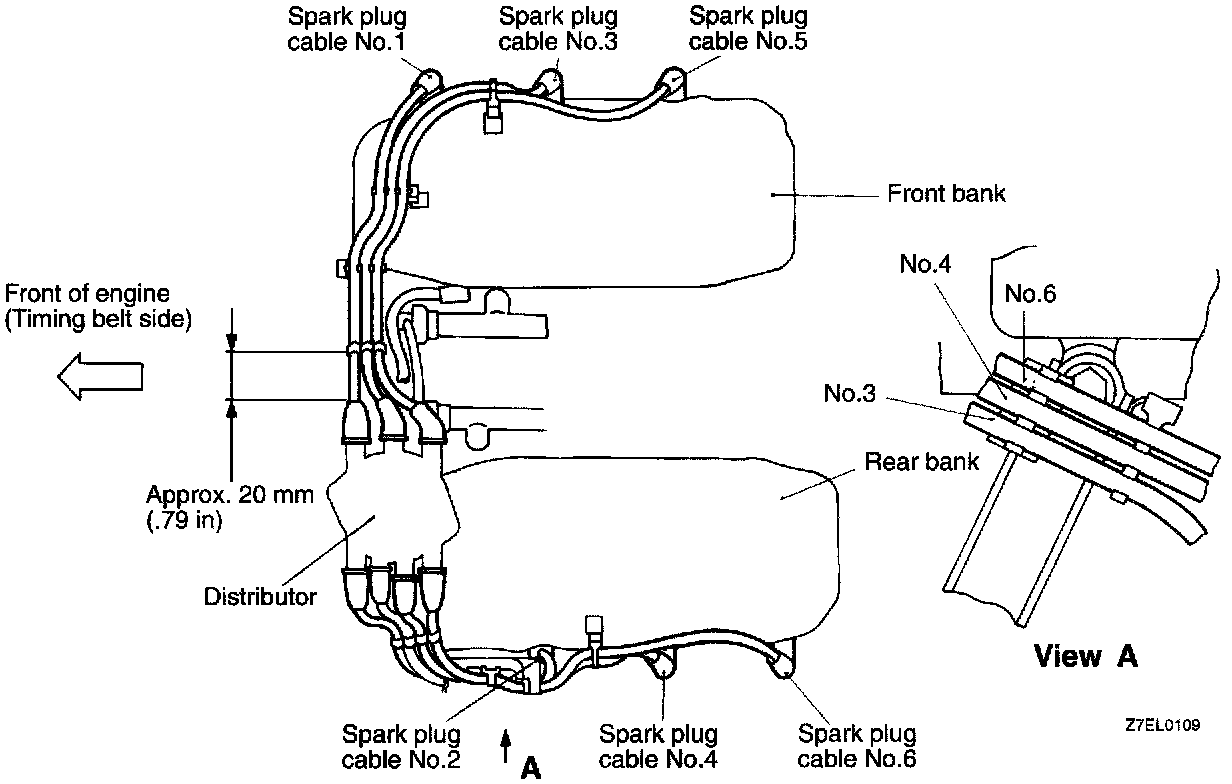 Improper arrangement of spark plug cables will induce voltage between the cables, causing miss firing and developing a surge at acceleration in high-speed operation. Therefore, be careful to arrange the spark plug cables properly by the following procedure.