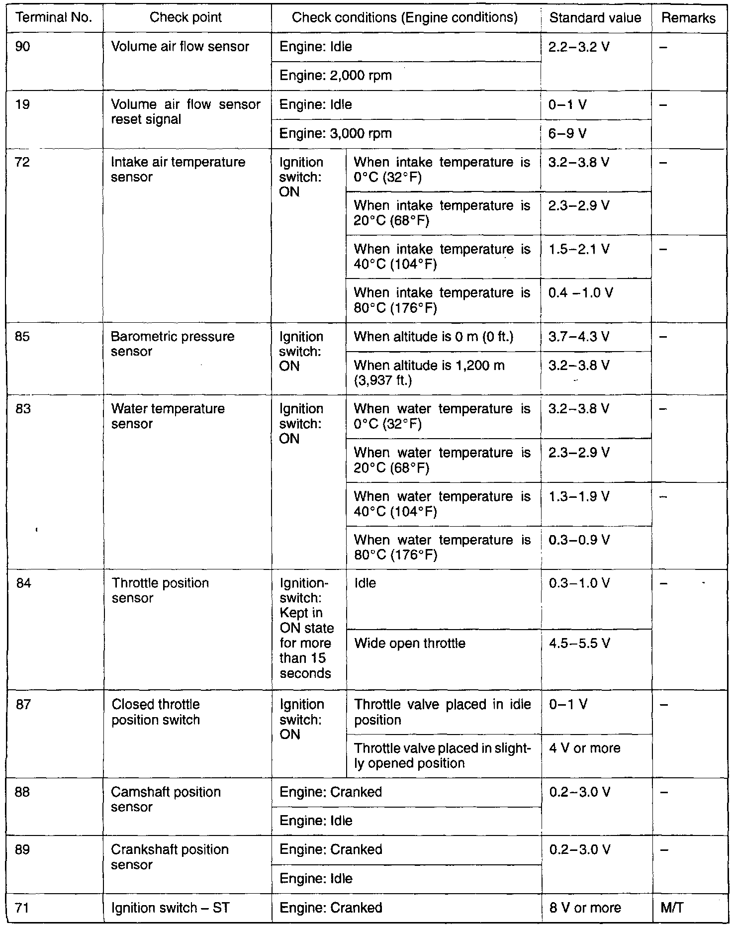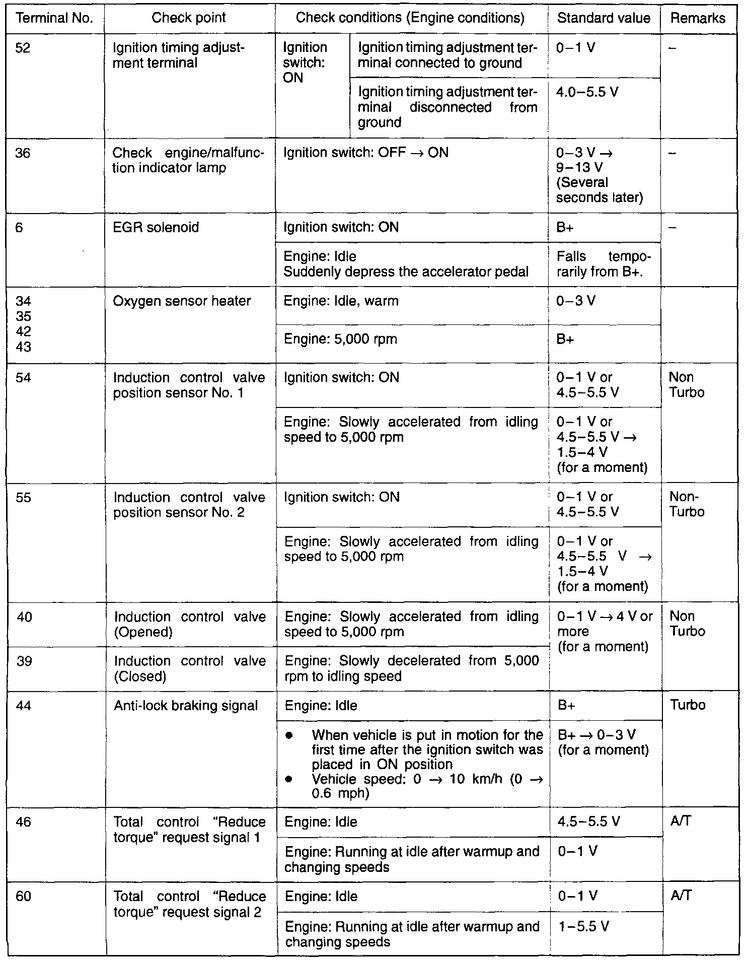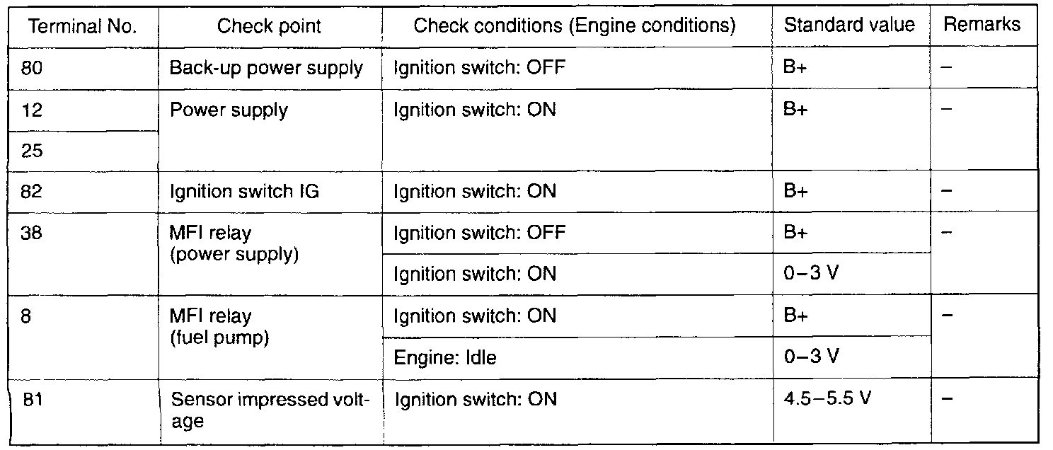 2. Insert the very thin probe from the wire side into contact with each of the terminals of the Engine Control Module (ECM) connector and check the voltage, while referring to the check chart.